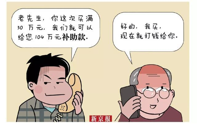 案例:70歲的劉某接到一個(gè)“保健專家”的電話,經(jīng)忽悠,劉某買了一萬多元的保健品。然而,對方又稱只要購滿50萬元,即可獲得補(bǔ)助款104萬元。當(dāng)劉某真的購買了遠(yuǎn)超50萬元的保健品后,那個(gè)從未謀面的專家再也聯(lián)系不上了。