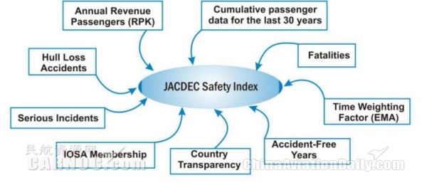 JACDEC安全指標(biāo)的評比參數(shù)包括在過去30年間航班墜毀的數(shù)量、傷亡人數(shù)、安全年份年數(shù)以及航司所在國家政府的透明度等參數(shù)。