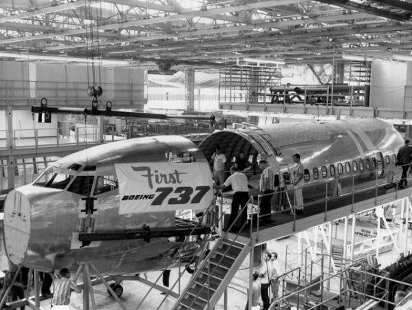 圖:1966年7月,首架737進(jìn)行機(jī)頭和機(jī)身的組裝。圖片來(lái)自《西雅圖時(shí)報(bào)》