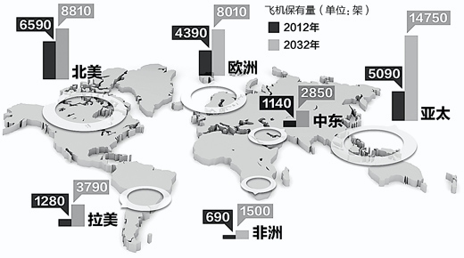 根據(jù)波音公司的預測,未來20年全球民機市場規(guī)模將翻一番,新興市場成為增長主動力。到2032年,全球?qū)⑿略龀^3.5萬架飛機,總額高達4.8萬億美元。亞太市場增幅最大,將新增1.282萬架飛機,總額1.89萬億美元。其中,中國市場發(fā)展最為迅速。空客公司總裁兼首席執(zhí)行官密法布里斯·布利葉認為,中國航空業(yè)的迅速發(fā)展是中國經(jīng)濟社會發(fā)展的必然產(chǎn)物,中國航空業(yè)發(fā)展的年均增速約為10%,同期全球航空業(yè)的增速則為5%。在未來20年,中國將成為世界最大的航空市場。