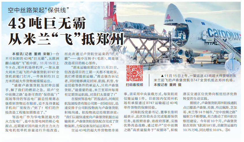 “感謝盧森堡貨航及時伸出援手,解了我們的燃眉之急。鄭盧‘空中絲綢之路’是條可貴的‘保供線’!”現(xiàn)場等待的鄒縣電廠副總經(jīng)理蔣志強看到貨物近在眼前,迫不及待拿起手機向廠里報告:“到了!咱們的升級改造工程能如期推進了?!?