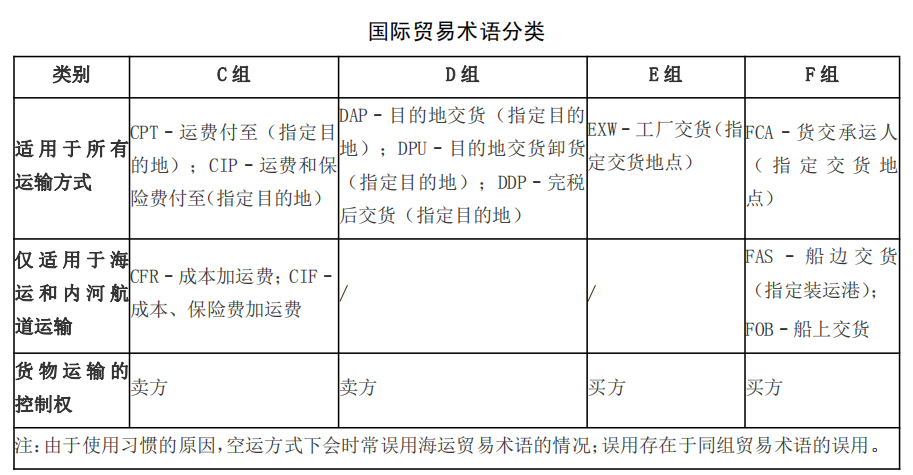 在國際貿(mào)易的貨物銷售合同中,進(jìn)出口商使用國際商會《國際貿(mào)易術(shù)語解釋通則》(Incoterms),界定買賣雙方在風(fēng)險、成本、運輸和保險方面的義務(wù),避免誤解、爭議與因此導(dǎo)致的損失以及其他法律難題。根據(jù)最新的《國際貿(mào)易術(shù)語解釋通則》2020版,國際貿(mào)易術(shù)語共分成2類4組11個。