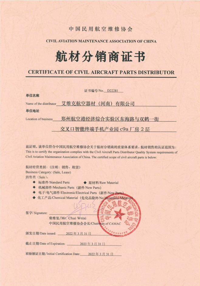 AVC Parts Supply (HeNan)Co., Ltd. obtained the certificate of distributor of aviation materials