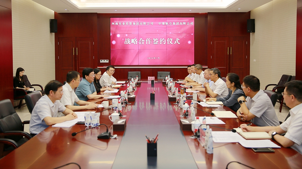 7月18日下午,中豫航空集團(tuán)與河南農(nóng)投集團(tuán)在農(nóng)投國(guó)際中心舉行工作會(huì)商,簽訂戰(zhàn)略合作協(xié)議。中豫航空集團(tuán)黨委書記、董事長(zhǎng)張明超;河南農(nóng)投集團(tuán)黨委書記、董事長(zhǎng)李曉寰,總經(jīng)理、副董事長(zhǎng)張淑杰參加會(huì)談并見證雙方簽約。中豫航空集團(tuán)副總經(jīng)理劉霞,河南農(nóng)投集團(tuán)副總經(jīng)理張峰代表雙方簽署戰(zhàn)略合作協(xié)議。雙方相關(guān)業(yè)務(wù)負(fù)責(zé)人參加。